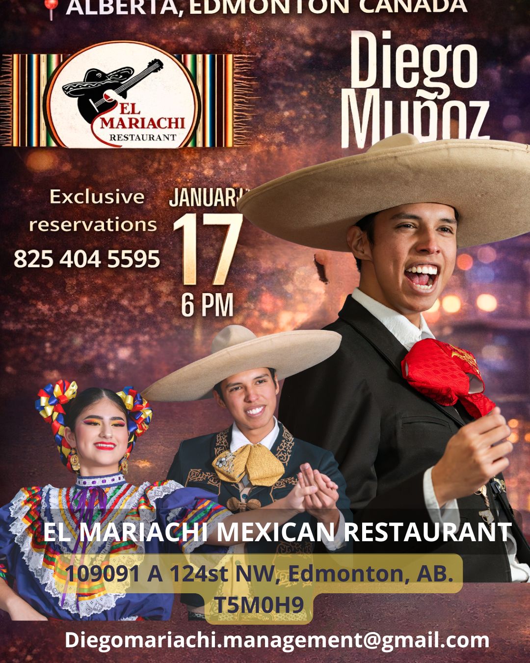 Enjoy live music , featuring Diego Muñoz at El Mariachi— 10991 A 124 St., on January 17th, 20th, and 25th, starting at 6pm. Mexican Beers will be on special: 7 for $49.99!