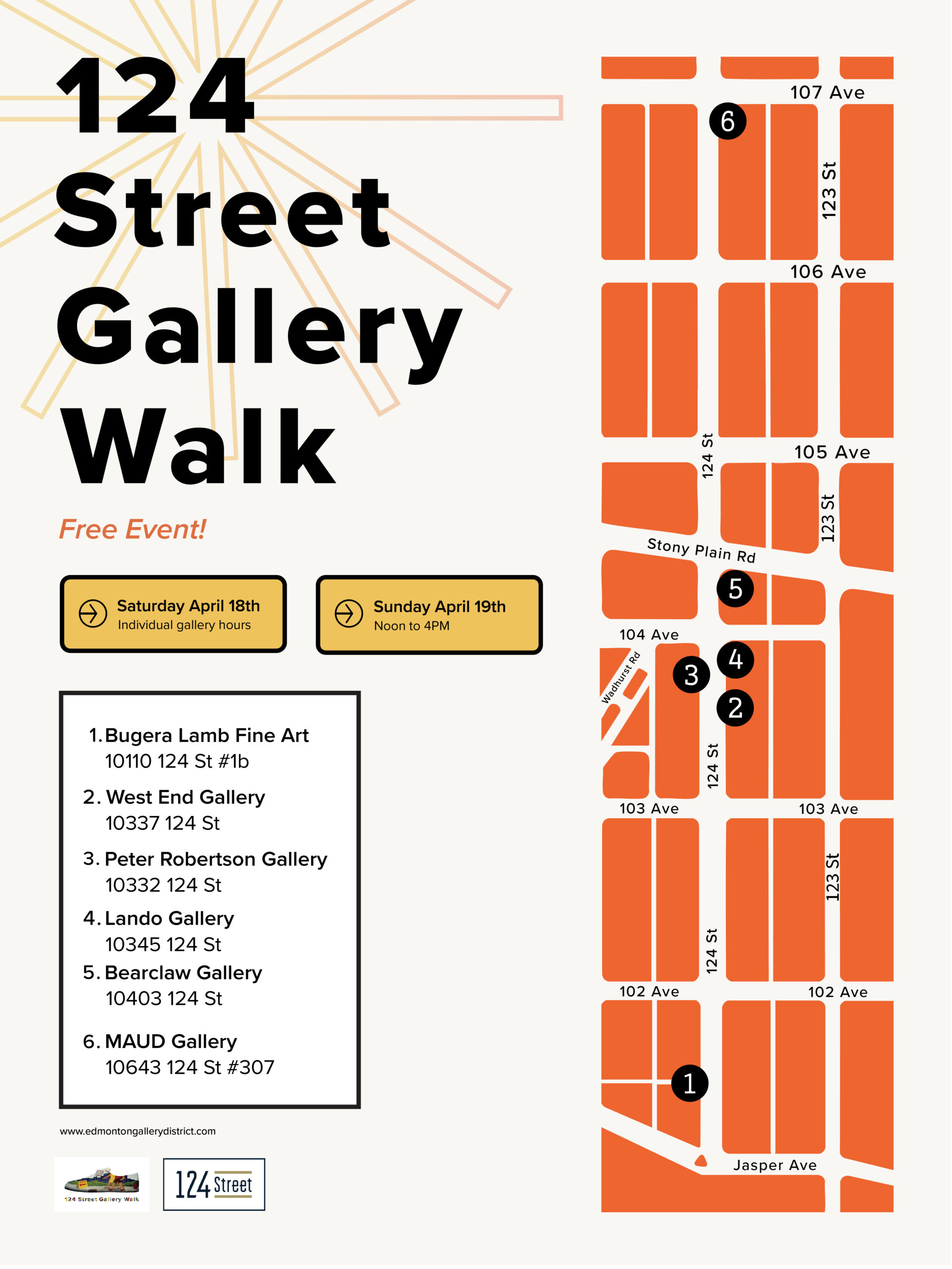 Spring Gallery Walk is Back Join the commercial galleries of 124 Street & Area for their seasonal gallery walk featuring new exhibitions. Saturday, April 18th, follows individual gallery hours, and Sunday, April 19th, runs from noon to 4pm. This is a free event! Enjoy a collection of different art exhibitions. While you’re in the neighbourhood, come dine in, shop, and explore our local 124 Street & Area businesses